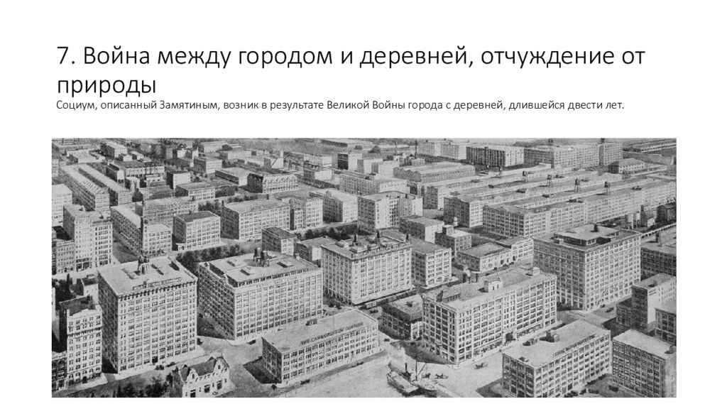 Слайд 11: 7. Война между городом и деревней, отчуждение от природы Социум, описанный Замятиным, возник в результате Великой Войны города с деревней, длившейся двести лет