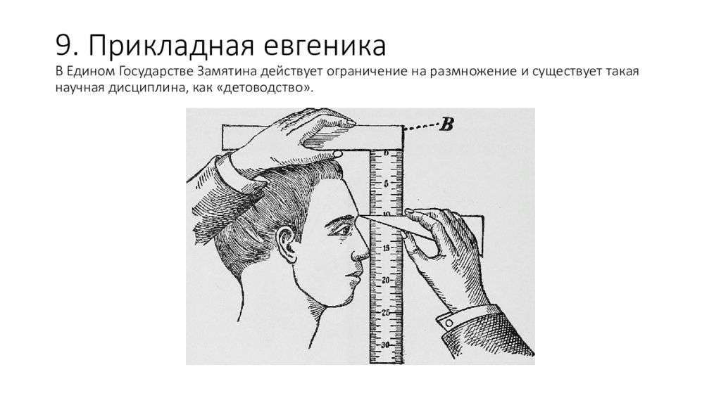 Слайд 13: 9. Прикладная евгеника В Едином Государстве Замятина действует ограничение на размножение и существует такая научная дисциплина, как « детоводство »