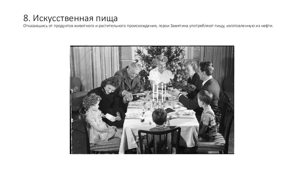 Слайд 12: 8. Искусственная пища Отказавшись от продуктов животного и растительного происхождения, герои Замятина употребляют пищу, изготовленную из нефти
