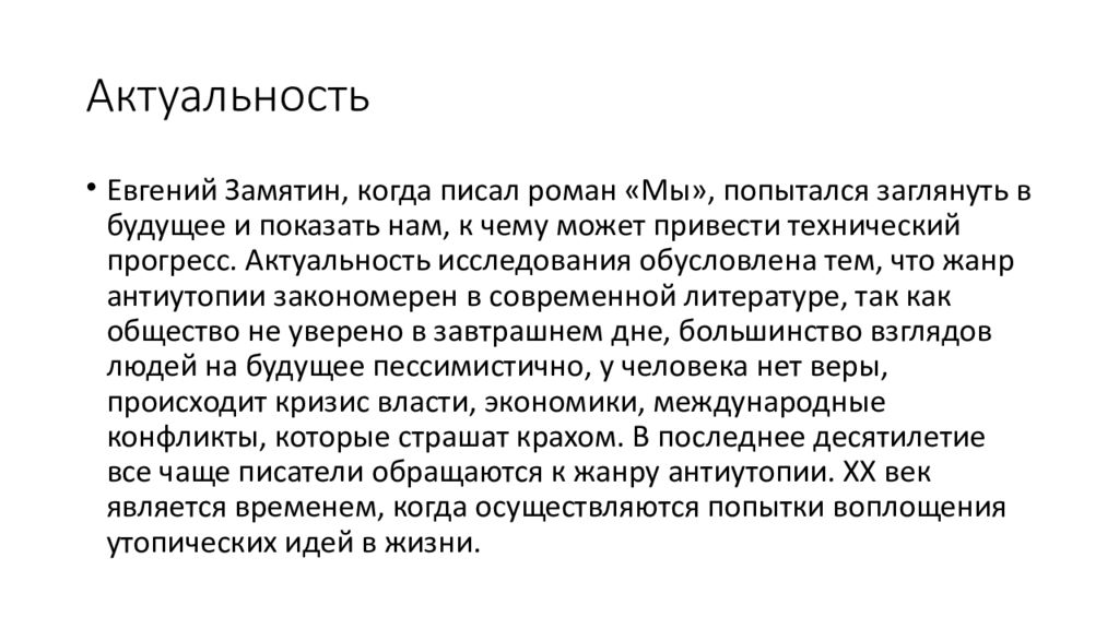 Евгений Замятин, когда писал роман «Мы», попытался заглянуть в будущее и показать нам, к чему может привести технический прогресс. Актуальность исследования обусловлена тем, что жанр антиутопии закономерен в современной литературе, так как общество не уверено в завтрашнем дне, большинство взглядов людей на будущее пессимистично, у человека нет веры, происходит кризис власти, экономики, международные конфликты, которые страшат крахом. В последнее десятилетие все чаще писатели обращаются к жанру антиутопии. ХХ век является временем, когда осуществляются попытки воплощения утопических идей в жизни.