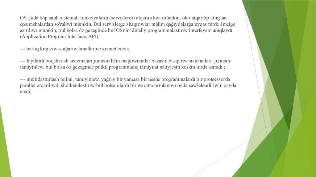 OS júdá kóp sanlı sistemalı funkciyalardı ( servislerdi ) atqara alıwı múmkin, olar atqarilip atirg’an qosımshalardan so'raliwi múmkin. Bul servislerge shaqırıwlar málim qaǵıydalarǵa uyqas túrde ámelge asırılıwı múmkin, bul bolsa óz gezeginde bul OSnin ’ ámeliy programmalastırıw interfeysin anıqlaydı (Application Program Interface, API); --- barlıq kirgiziw-shıǵarıw ámellerine xızmet etedi ; --- fayllardı boqsharish sistemaları jumısın hám maǵlıwmatlar bazasın basqarıw sistemaları jumısın támiyinlew, bul bolsa óz gezeginde pútkil programmalıq támiynat nátiyjesin keskin túrde asıradı ; --- multidasturlash rejimi, támiyinlew, yaǵnıy bir yamasa bir neshe programmalardı bir protsessorda parallel atqarılıwdı shólkemlestiriw-bul bolsa olardı bir waqıtta orınlanıwı oyda sawlelendiriwin payda etedi ;