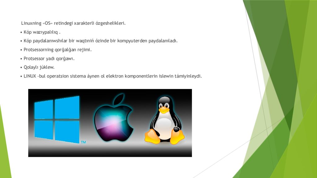 Linuxning «OS» retindegi xarakterli ózgeshelikleri. • Kóp wazıypalılıq. • Kóp paydalanıwshılar bir waqtıniń ózinde bir kompyuterden paydalanıladı. • Protsessorning qorǵalǵan rejimi. • Protsessor yadı qorǵawı. • Qolaylı júklew. • LINUX - bul operatsion sistema áynen ol elektron komponentlerin islewin támiyinleydi.