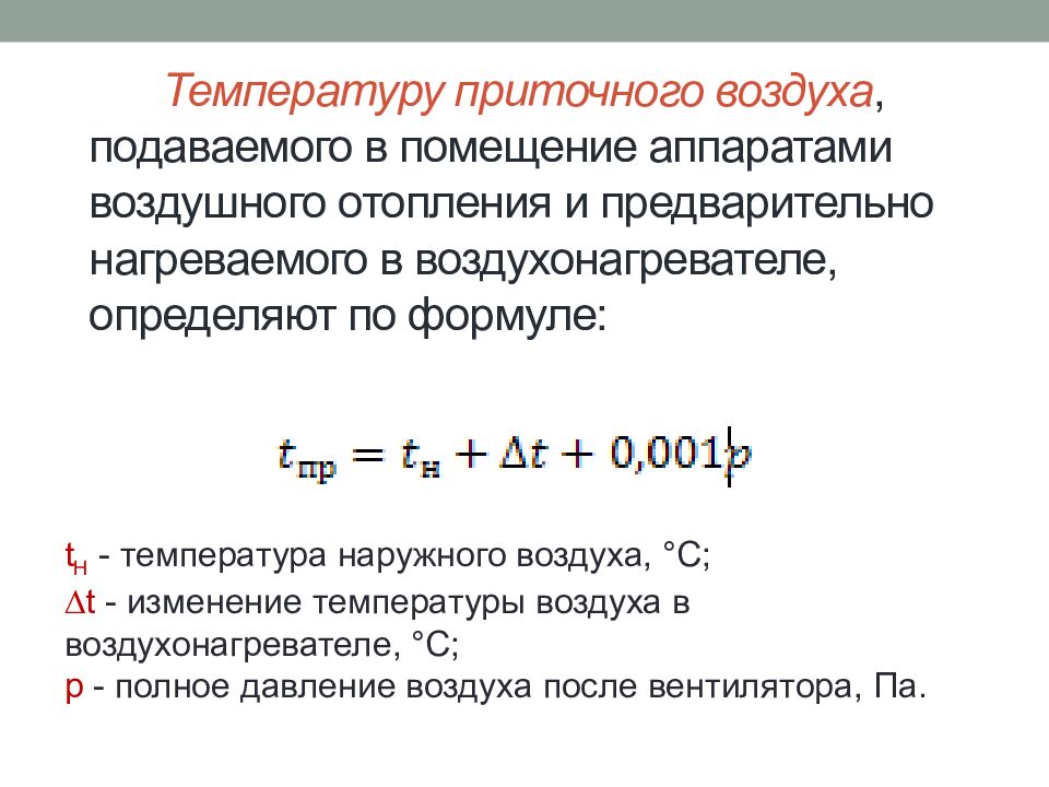 Слайд 8: Температуру приточного воздуха, подаваемого в помещение аппаратами воздушного отопления и предварительно нагреваемого в воздухонагревателе, определяют по формуле: