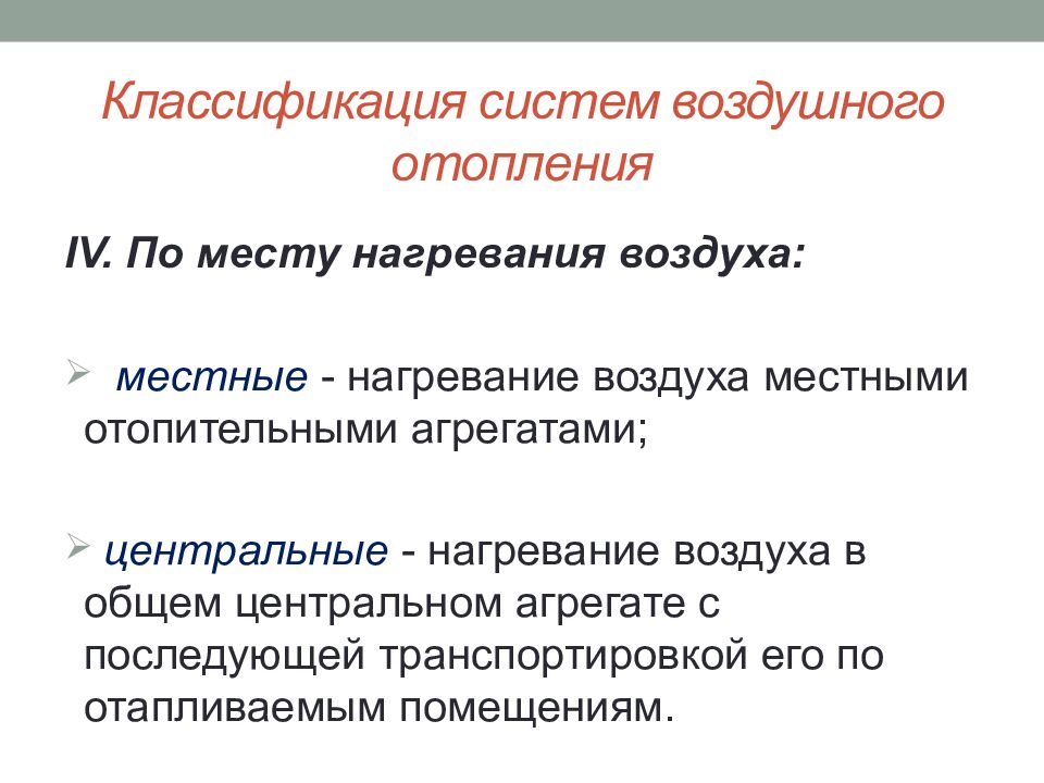 IV. По месту нагревания воздуха: местные - нагревание воздуха местными отопительными агрегатами; центральные - нагревание воздуха в общем центральном агрегате с последующей транспортировкой его по отапливаемым помещениям.