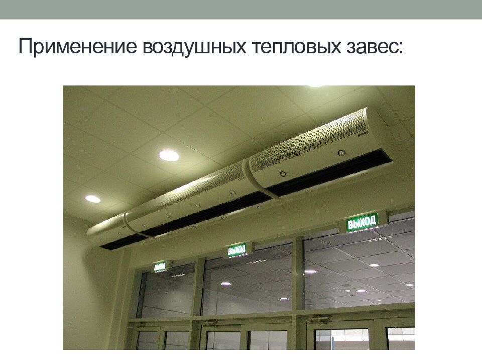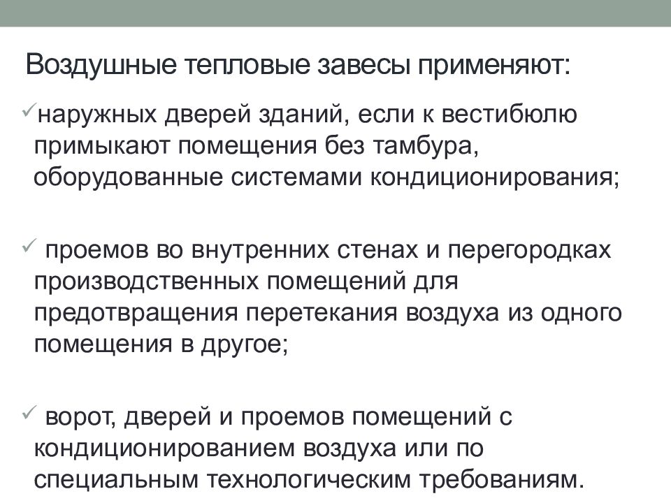 наружных дверей зданий, если к вестибюлю примыкают помещения без тамбура, оборудованные системами кондиционирования ; проемов во внутренних стенах и перегородках производственных помещений для предотвращения перетекания воздуха из одного помещения в другое ; ворот, дверей и проемов помещений с кондиционированием воздуха или по специальным технологическим требованиям.
