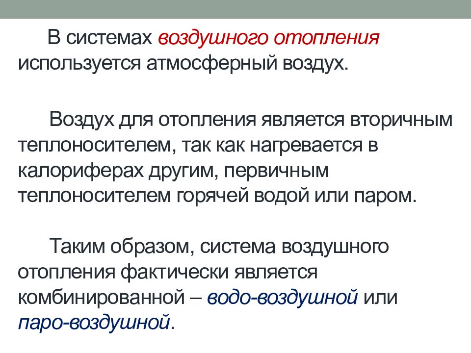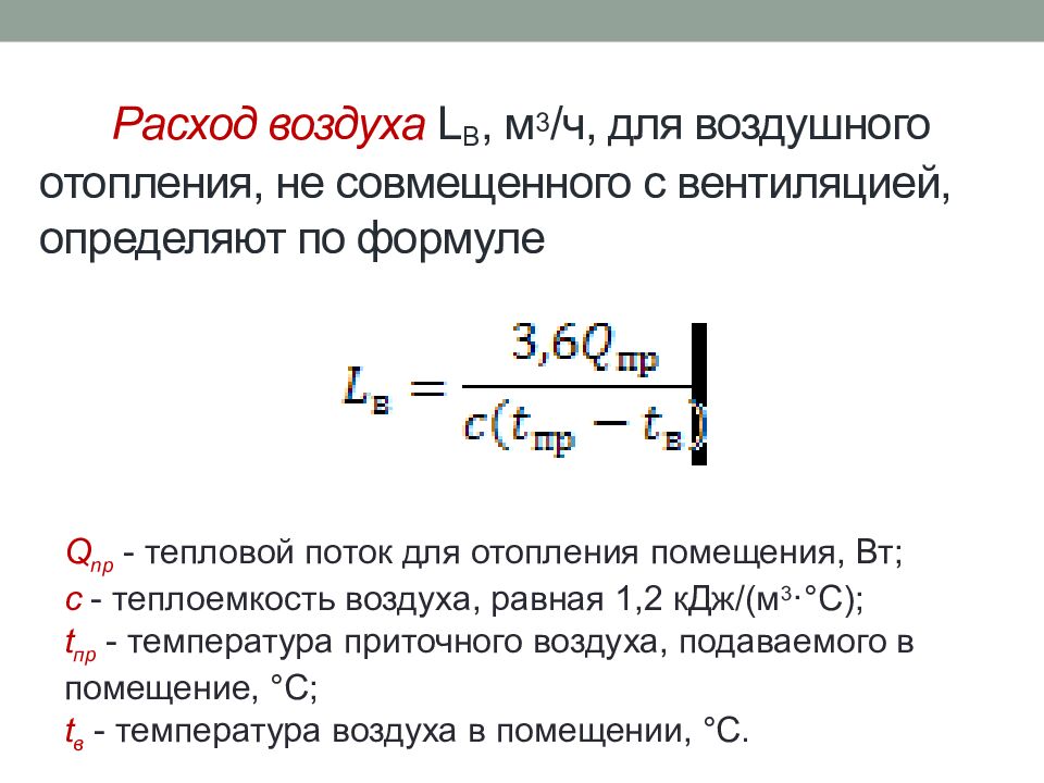 Слайд 7: Расход воздуха L B, м 3 /ч, для воздушного отопления, не совмещенного с вентиляцией, определяют по формуле