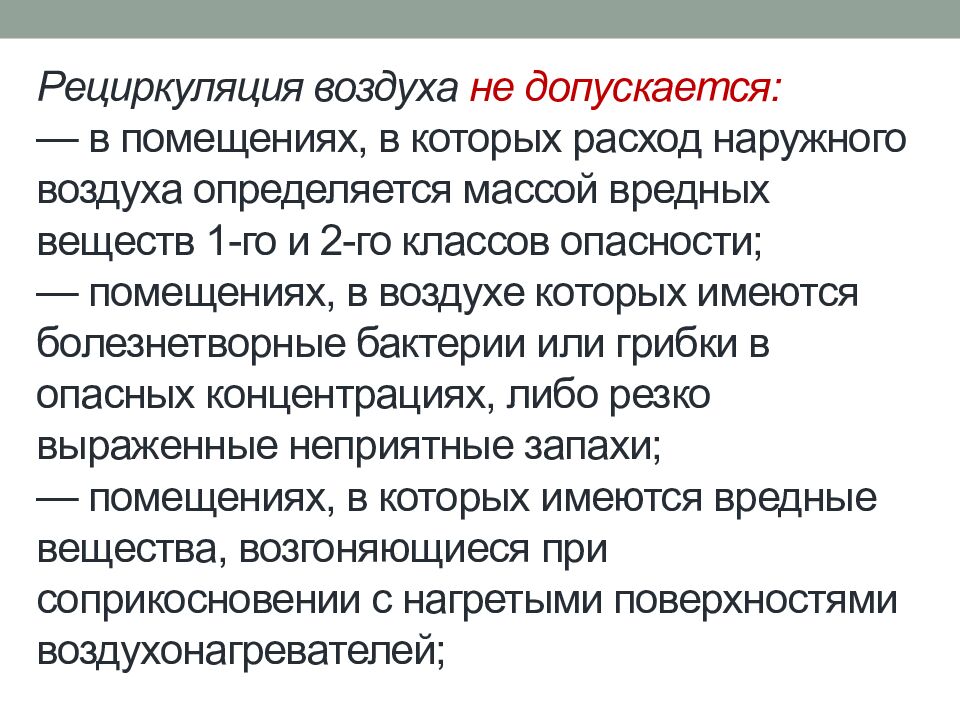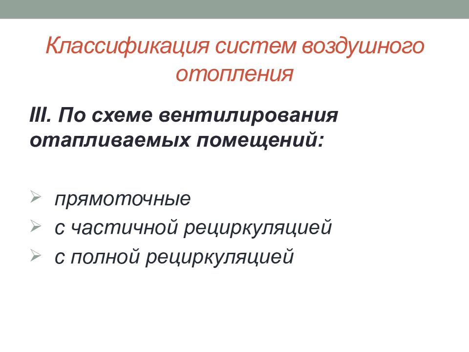 III. По схеме вентилирования отапливаемых помещений: прямоточные с частичной рециркуляцией с полной рециркуляцией