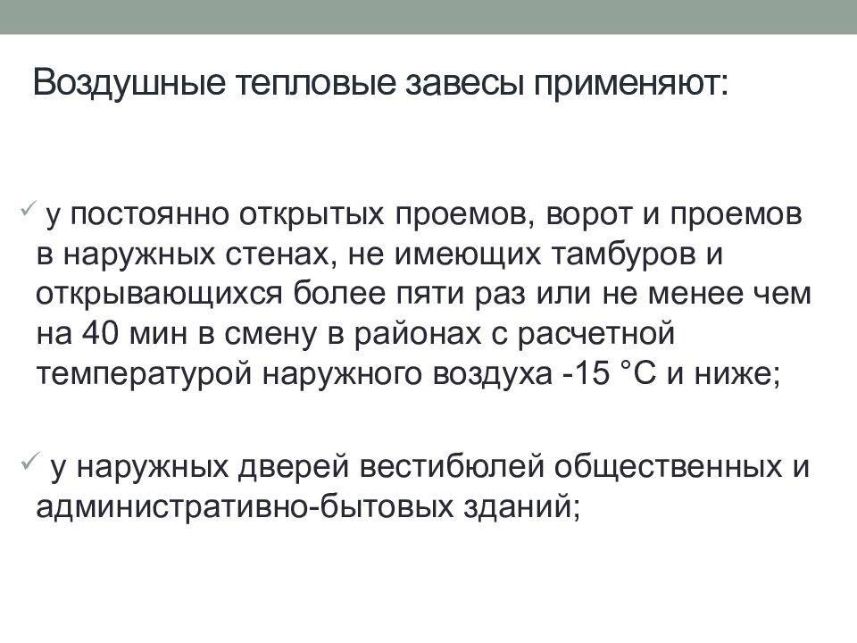 у постоянно открытых проемов, ворот и проемов в наружных стенах, не имеющих тамбуров и открывающихся более пяти раз или не менее чем на 40 мин в смену в районах с расчетной температурой наружного воздуха -15 °С и ниже ; у наружных дверей вестибюлей общественных и административно-бытовых зданий ;
