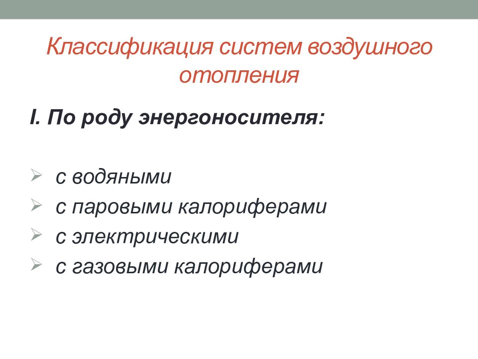 I. По роду энергоносителя: с водяными с паровыми калориферами с электрическими с газовыми калориферами