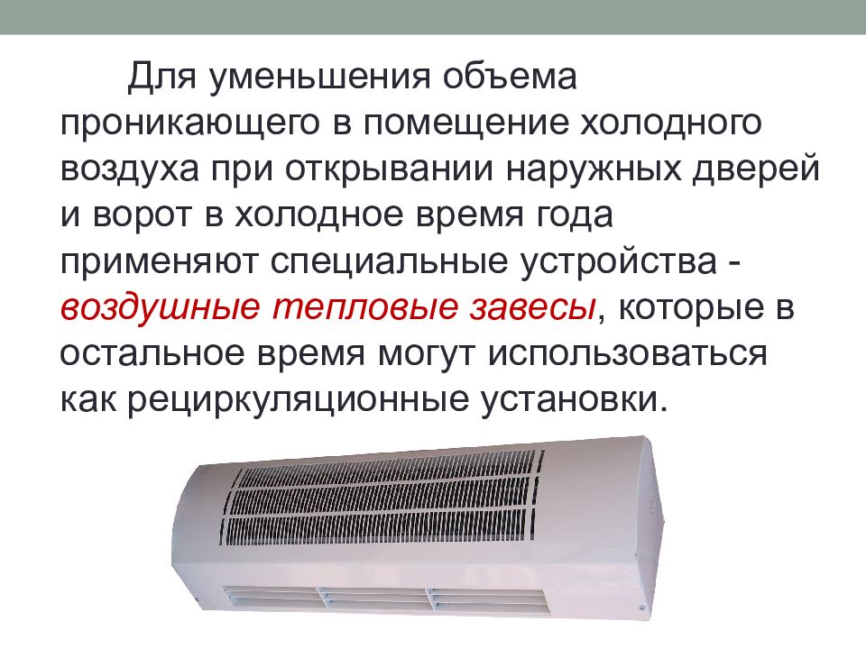 Для уменьшения объема проникающего в помещение холодного воздуха при открывании наружных дверей и ворот в холодное время года применяют специальные устройства - воздушные тепловые завесы, которые в остальное время могут использоваться как рециркуляционные установки.