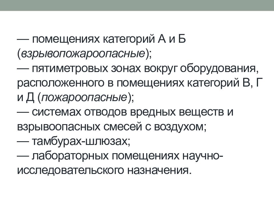 — помещениях категорий А и Б ( взрывопожароопасные ); — пятиметровых зонах вокруг оборудования, расположенного в помещениях категорий В, Г и Д ( пожароопасные ); — системах отводов вредных веществ и взрывоопасных смесей с воздухом; — тамбурах-шлюзах; — лабораторных помещениях научно-исследовательского назначения.