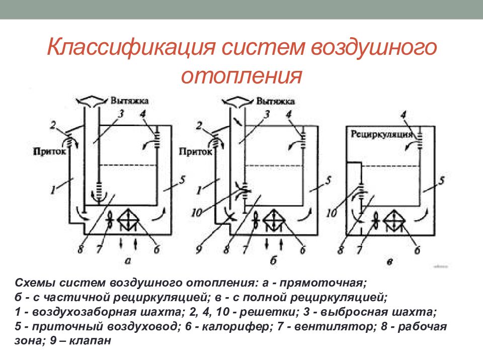 Схемы систем воздушного отопления: а - прямоточная; б - с частичной рециркуляцией; в - с полной рециркуляцией ; 1 - воздухозаборная шахта; 2, 4, 10 - решетки; 3 - выбросная шахта; 5 - приточный воздуховод; 6 - калорифер; 7 - вентилятор; 8 - рабочая зона; 9 – клапан