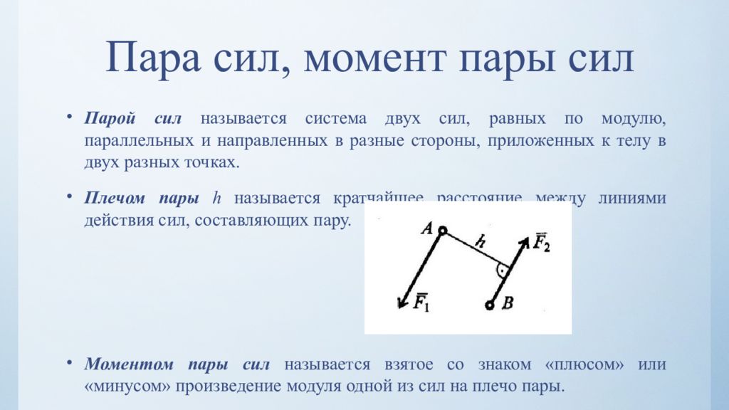 Парой сил называется система двух сил, равных по модулю, параллельных и направленных в разные стороны, приложенных к телу в двух разных точках. Плечом пары h называется кратчайшее расстояние между линиями действия сил, составляющих пару. Моментом пары сил называется взятое со знаком «плюсом» или «минусом» произведение модуля одной из сил на плечо пары.