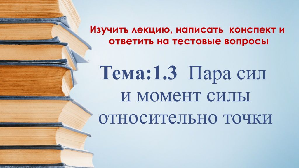 Первый слайд презентации: Тема:1.3 Пара сил и момент силы относительно точки