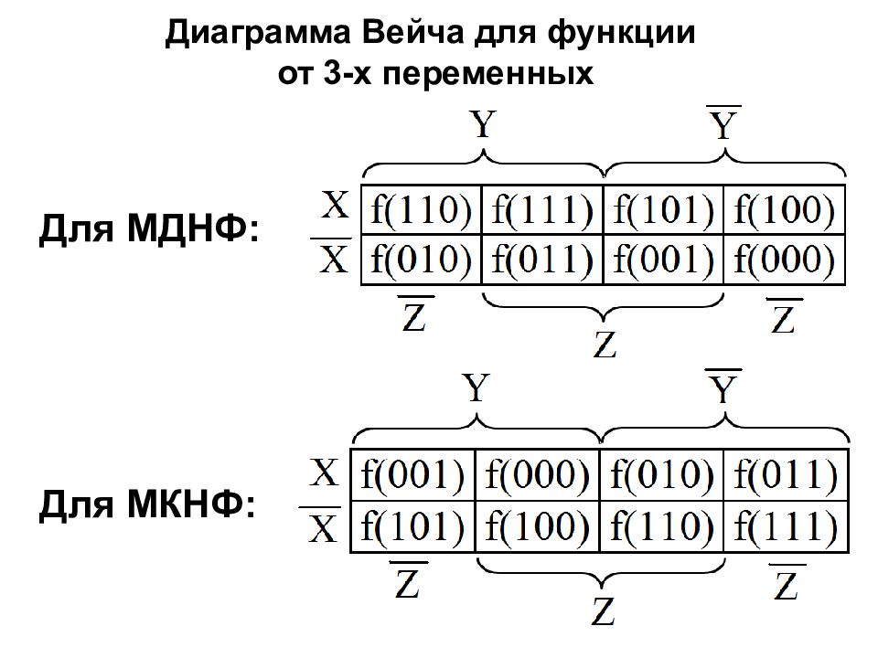 Пример построения диаграммы Вейча для функции от двух переменных Для МДНФ Для МКНФ F МДНФ = F МКНФ = X