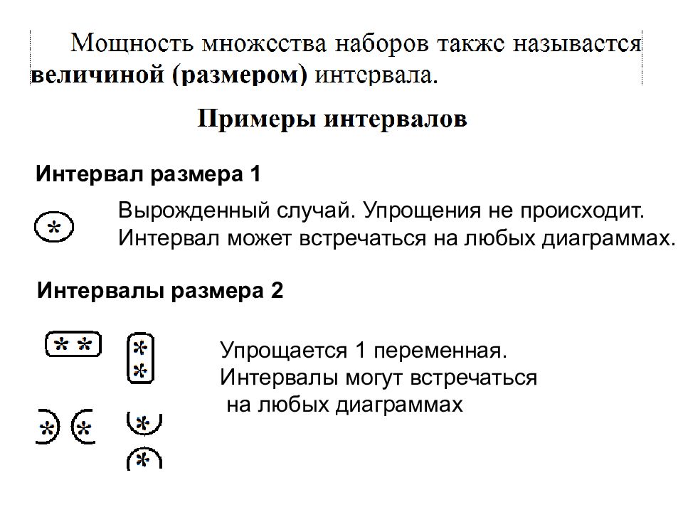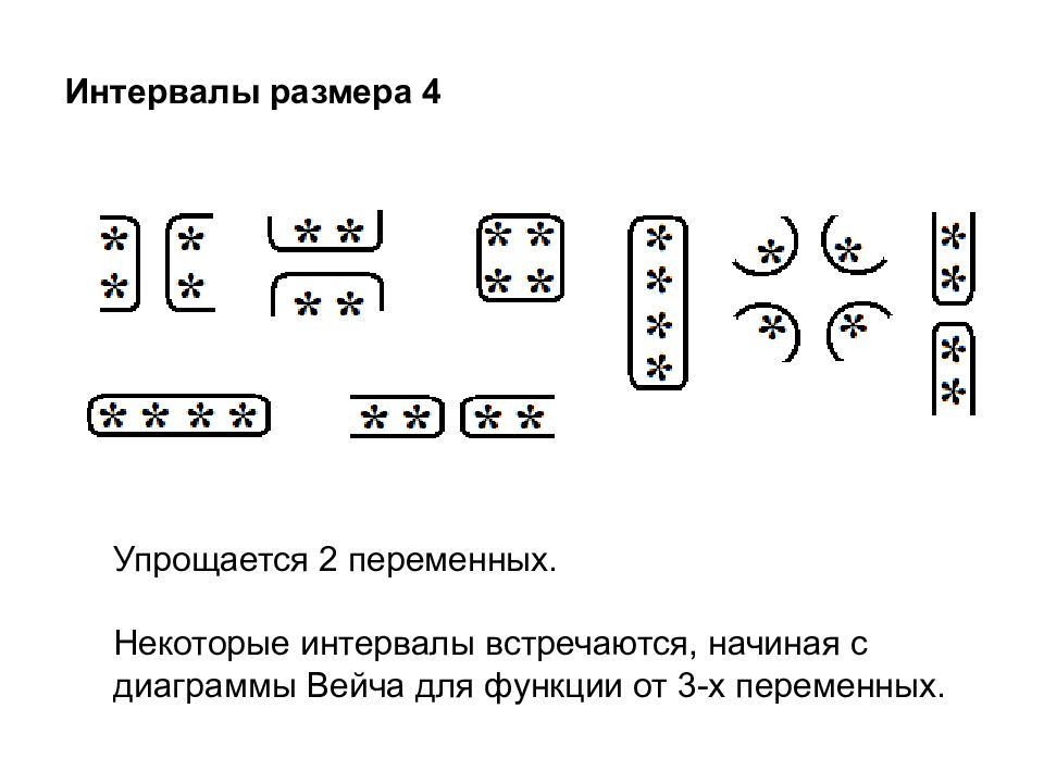 Интервал размера 1 Вырожденный случай. Упрощения не происходит. Интервал может встречаться на любых диаграммах. Интервалы размера 2 Упрощается 1 переменная. Интервалы могут встречаться на любых диаграммах
