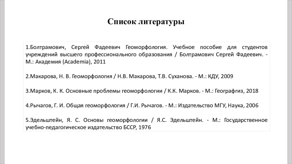 Болтрамович, Сергей Фадеевич Геоморфология. Учебное пособие для студентов учреждений высшего профессионального образования / Болтрамович Сергей Фадеевич. - М.: Академия ( Academia ), 2011 Макарова, Н. В. Геоморфология / Н.В. Макарова, Т.В. Суханова. - М.: КДУ, 2009 Марков, К. К. Основные проблемы геоморфологии / К.К. Марков. - М.: Географгиз, 2018 Рычагов, Г. И. Общая геоморфология / Г.И. Рычагов. - М.: Издательство МГУ, Наука, 2006 Эдельштейн, Я. С. Основы геоморфологии / Я.С. Эдельштейн. - М.: Государственное учебно-педагогическое издательство БССР, 1976 Список литературы