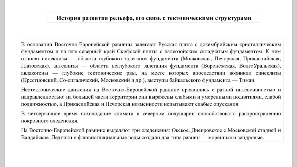 В основании Восточно-Европейской равнины залегают Русская плита с докембрийским кристаллическим фундаментом и на юге северный край Скифской плиты с палеозойским складчатым фундаментом. К ним относят синеклизы — области глубокого залегания фундамента (Московская, Печорская, Прикаспийская, Глазовская), антеклизы — области неглубокого залегания фундамента (Воронежская, ВолгоУральская ), авлакогены — глубокие тектонические рвы, на месте которых впоследствии возникли синеклизы ( Крестцовский, Со- лигаличский, Московский и др.), выступы байкальского фундамента — Тиман. Неотектонические движения на Восточно-Европейской равнине проявились с разной интенсивностью и направленностью: на большей части территории они выражены слабыми и умеренными поднятиями, слабой подвижностью, а Прикаспийская и Печорская низменности испытывают слабые опускания В четвертичное время похолодание климата в северном полушарии способствовало распространению покровного оледенения. На Восточно-Европейской равнине выделяют три оледенения: Окское, Днепровское с Московской стадией и Валдайское. Ледники и флювиогляциальные воды создали два типа равнин — моренные и зандровые. История развития рельефа, его связь с тектоническими структурами