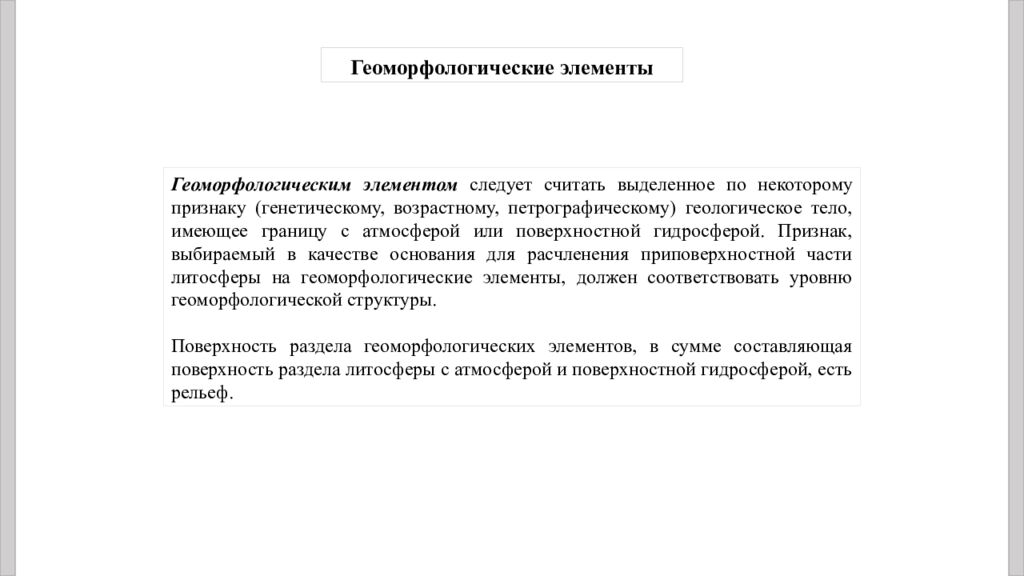 Геоморфологическим элементом следует считать выделенное по некоторому признаку (генетическому, возрастному, петрографическому) геологическое тело, имеющее границу с атмосферой или поверхностной гидросферой. Признак, выбираемый в качестве основания для расчленения приповерхностной части литосферы на геоморфологические элементы, должен соответствовать уровню геоморфологической структуры. Поверхность раздела геоморфологических элементов, в сумме составляющая поверхность раздела литосферы с атмосферой и поверхностной гидросферой, есть рельеф. Геоморфологические элементы