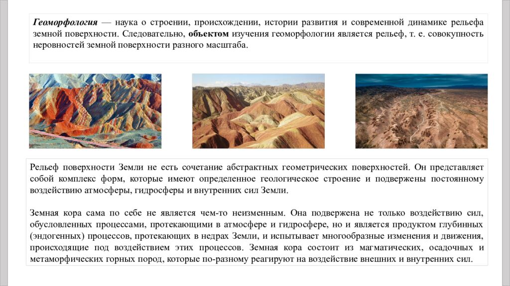 Геоморфология — наука о строении, происхождении, истории развития и современной динамике рельефа земной поверхности. Следовательно, объектом изучения геоморфологии является рельеф, т. е. совокупность неровностей земной поверхности разного масштаба. Рельеф поверхности Земли не есть сочетание абстрактных геометрических поверхностей. Он представляет собой комплекс форм, которые имеют определенное геологическое строение и подвержены постоянному воздействию атмосферы, гидросферы и внутренних сил Земли. Земная кора сама по себе не является чем-то неизменным. Она подвержена не только воздействию сил, обусловленных процессами, протекающими в атмосфере и гидросфере, но и является продуктом глубинных (эндогенных) процессов, протекающих в недрах Земли, и испытывает многообразные изменения и движения, происходящие под воздействием этих процессов. Земная кора состоит из магматических, осадочных и метаморфических горных пород, которые по-разному реагируют на воздействие внешних и внутренних сил.