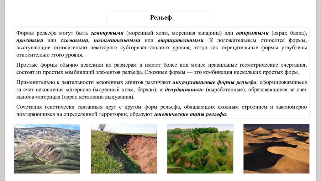 Рельеф Формы рельефа могут быть замкнутыми (моренный холм, моренная западина) или открытыми (овраг, балка), простыми или сложными, положительными или отрицательными. К положительным относятся формы, выступающие относительно некоторого субгоризонтального уровня, тогда как отрицательные формы углублены относительно этого уровня. Простые формы обычно невелики по размерам и имеют более или менее правильные геометрические очертания, состоят из простых комбинаций элементов рельефа. Сложные формы — это комбинация нескольких простых форм. Применительно к деятельности экзогенных агентов различают аккумулятивные формы рельефа, сформировавшиеся за счет накопления материала (моренный холм, бархан), и денудационные (выработанные), образовавшиеся за счет выноса материала (овраг, котловина выдувания). Сочетания генетически связанных друг с другом форм рельефа, обладающих сходным строением и закономерно повторяющихся на определенной территории, образуют генетические типы рельефа.