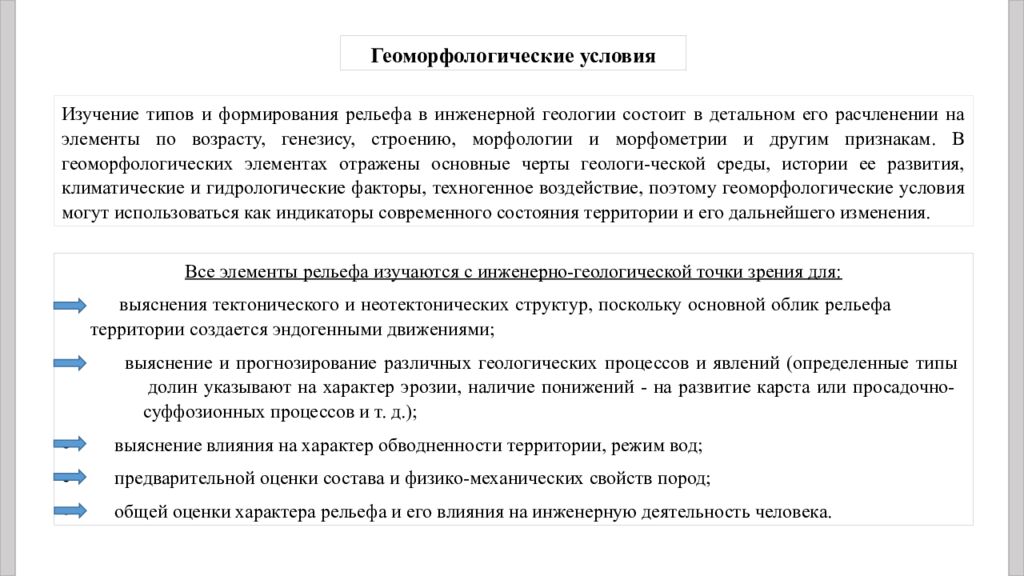 Изучение типов и формирования рельефа в инженерной геологии состоит в детальном его расчленении на элементы по возрасту, генезису, строению, морфологии и морфометрии и другим признакам. В геоморфологических элементах отражены основные черты геологи-ческой среды, истории ее развития, климатические и гидрологические факторы, техногенное воздействие, поэтому геоморфологические условия могут использоваться как индикаторы современного состояния территории и его дальнейшего изменения. Геоморфологические условия Все элементы рельефа изучаются с инженерно-геологической точки зрения для: выяснения тектонического и неотектонических структур, поскольку основной облик рельефа территории создается эндогенными движениями; выяснение и прогнозирование различных геологических процессов и явлений ( о пределенные типы долин указывают на характер эрозии, наличие понижений - на развитие карста или просадочно- суффозионных процессов и т. д.); выяснение влияния на характер обводненности территории, режим вод; предварительной оценки состава и физико-механических свойств пород; общей оценки характера рельефа и его влияния на инженерную деятельность человека.