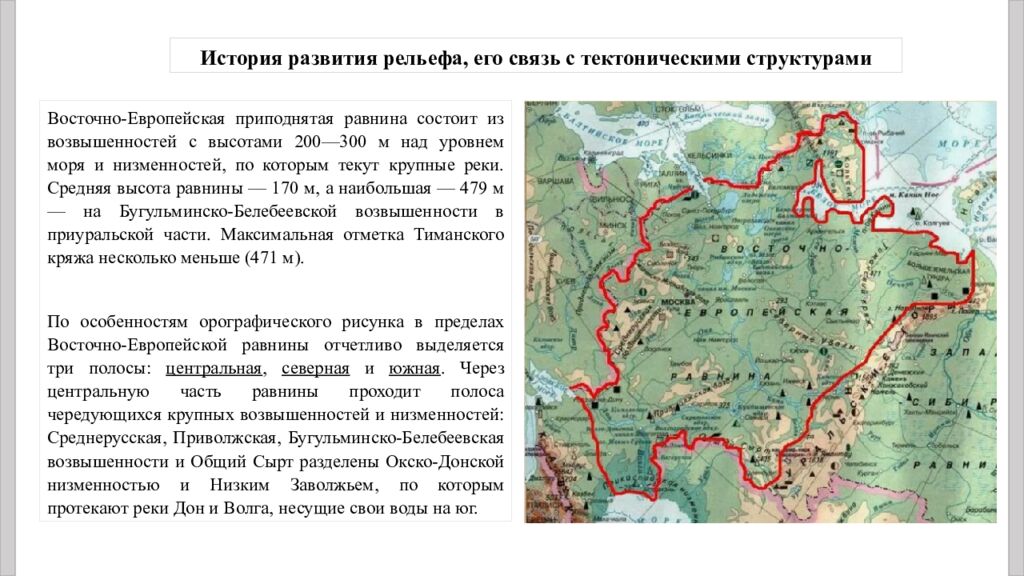 Восточно-Европейская приподнятая равнина состоит из возвышенностей с высотами 200—300 м над уровнем моря и низменностей, по которым текут крупные реки. Средняя высота равнины — 170 м, а наибольшая — 479 м — на Бугульминско -Белебеевской возвышенности в приуральской части. Максимальная отметка Тиманского кряжа несколько меньше (471 м). По особенностям орографического рисунка в пределах Восточно-Европейской равнины отчетливо выделяется три полосы: центральная, северная и южная. Через центральную часть равнины проходит полоса чередующихся крупных возвышенностей и низменностей: Среднерусская, Приволжская, Бугульминско -Белебеевская возвышенности и Общий Сырт разделены Окско-Донской низменностью и Низким Заволжьем, по которым протекают реки Дон и Волга, несущие свои воды на юг. История развития рельефа, его связь с тектоническими структурами