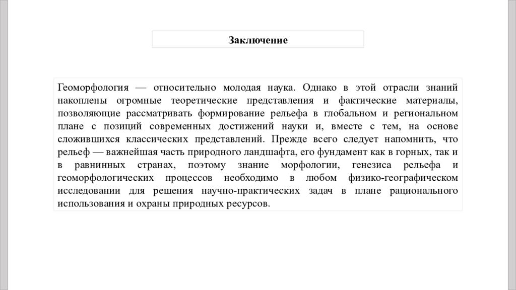 Геоморфология — относительно молодая наука. Однако в этой отрасли знаний накоплены огромные теоретические представления и фактические материалы, позволяющие рассматривать формирование рельефа в глобальном и региональном плане с позиций современных достижений науки и, вместе с тем, на основе сложившихся классических представлений. Прежде всего следует напомнить, что рельеф — важнейшая часть природного ландшафта, его фундамент как в горных, так и в равнинных странах, поэтому знание морфологии, генезиса рельефа и геоморфологических процессов необходимо в любом физико-географическом исследовании для решения научно-практических задач в плане рационального использования и охраны природных ресурсов. Заключение