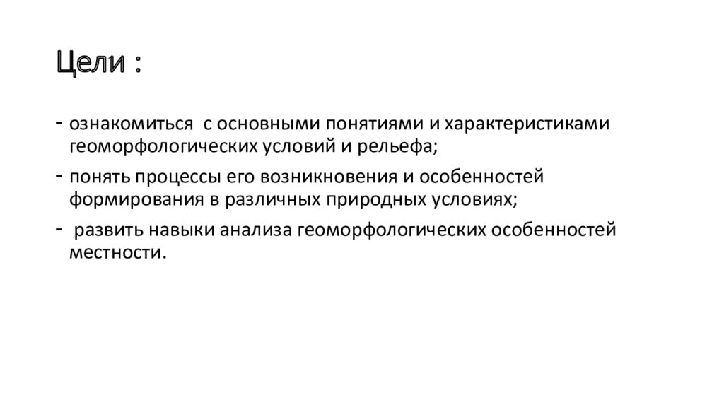 ознакомиться с основными понятиями и характеристиками геоморфологических условий и рельефа; понять процессы его возникновения и особенностей формирования в различных природных условиях; развить навыки анализа геоморфологических особенностей местности.