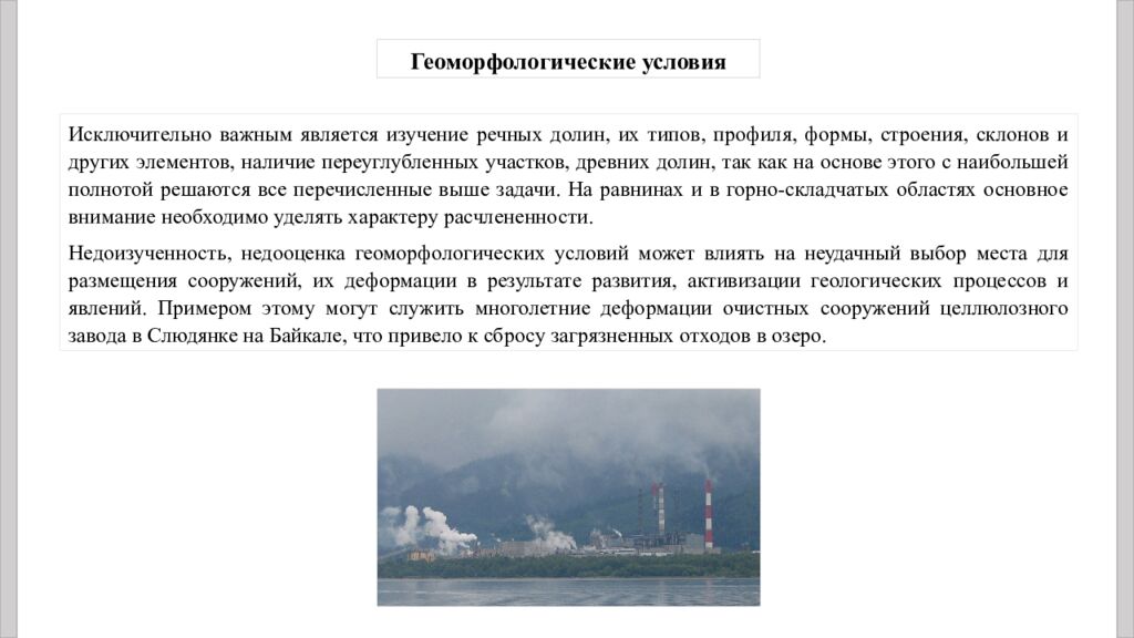 Исключительно важным является изучение речных долин, их типов, профиля, формы, строения, склонов и других элементов, наличие переуглубленных участков, древних долин, так как на основе этого с наибольшей полнотой решаются все перечисленные выше задачи. На равнинах и в горно-складчатых областях основное внимание необходимо уделять характеру расчлененности. Недоизученность, недооценка геоморфологических условий может влиять на неудачный выбор места для размещения сооружений, их деформации в результате развития, активизации геологических процессов и явлений. Примером этому могут служить многолетние деформации очистных сооружений целлюлозного завода в Слюдянке на Байкале, что привело к сбросу загрязненных отходов в озеро. Геоморфологические условия