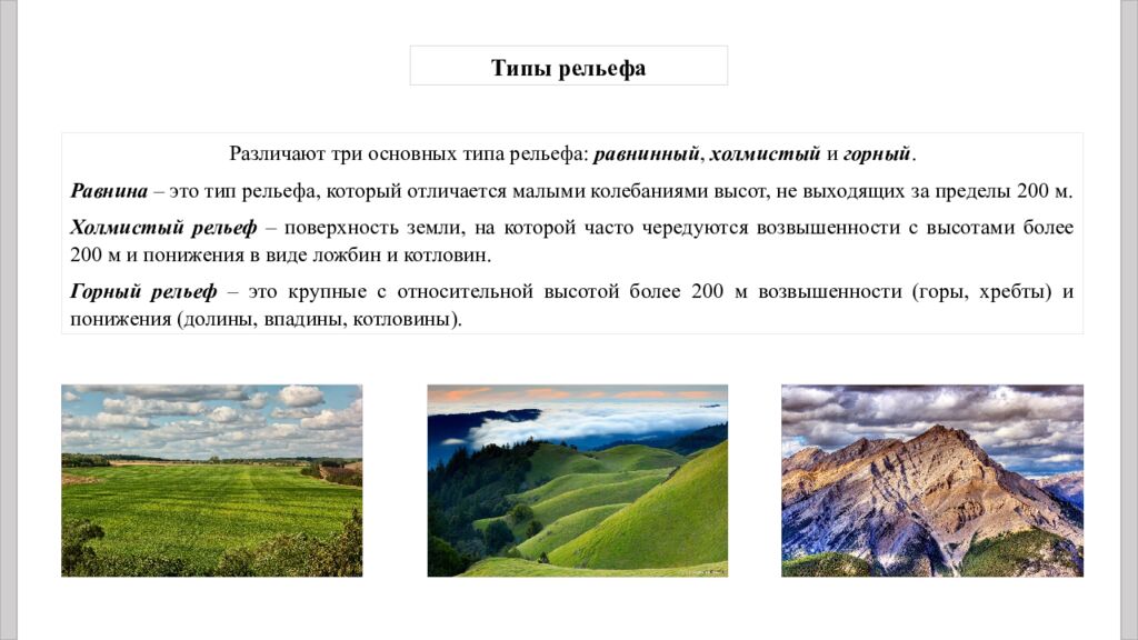 Различают три основных типа рельефа: равнинный, холмистый и горный. Равнина – это тип рельефа, который отличается малыми колебаниями высот, не выходящих за пределы 200 м. Холмистый рельеф – поверхность земли, на которой часто чередуются возвышенности с высотами более 200 м и понижения в виде ложбин и котловин. Горный рельеф – это крупные с относительной высотой более 200 м возвышенности (горы, хребты) и понижения (долины, впадины, котловины). Типы рельефа
