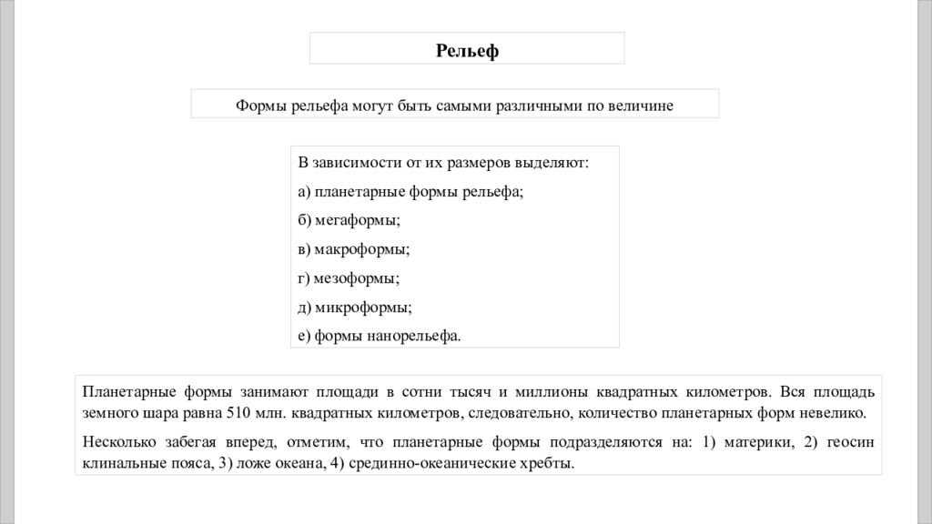 Рельеф В зависимости от их размеров выделяют: а) планетарные формы рельефа; б) мегаформы ; в) макроформы; г) мезоформы ; д) микроформы; е) формы нанорельефа. Формы рельефа могут быть самыми различными по величине Планетарные формы занимают площади в сотни тысяч и миллионы квадратных километров. Вся площадь земного шара равна 510 млн. квадратных километров, следовательно, количество планетарных форм невелико. Несколько забегая вперед, отметим, что планетарные формы подразделяются на: 1) материки, 2) геосинклинальные пояса, 3) ложе океана, 4) срединно-океанические хребты.