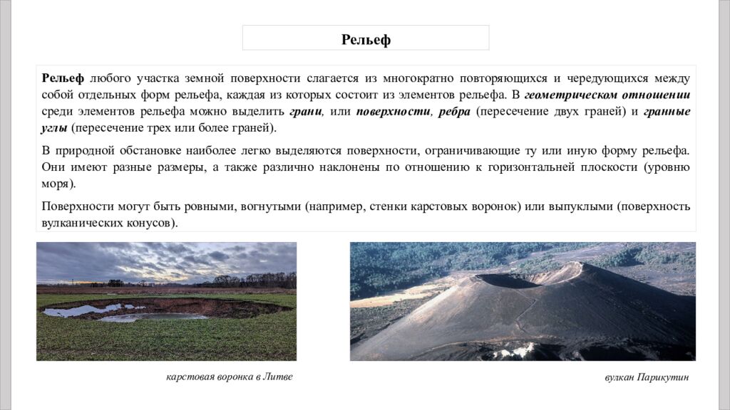 Рельеф любого участка земной поверхности слагается из многократно повторяющихся и чередующихся между собой отдельных форм рельефа, каждая из которых состоит из элементов рельефа. В геометрическом отношении среди элементов рельефа можно выделить грани, или поверхности, ребра (пересечение двух граней) и гранные углы (пересечение трех или более граней). В природной обстановке наиболее легко выделяются поверхности, ограничивающие ту или иную форму рельефа. Они имеют разные размеры, а также различно наклонены по отношению к горизонтальней плоскости (уровню моря). Поверхности могут быть ровными, вогнутыми (например, стенки карстовых воронок) или выпуклыми (поверхность вулканических конусов). Рельеф карстовая воронка в Литве вулкан Парикутин