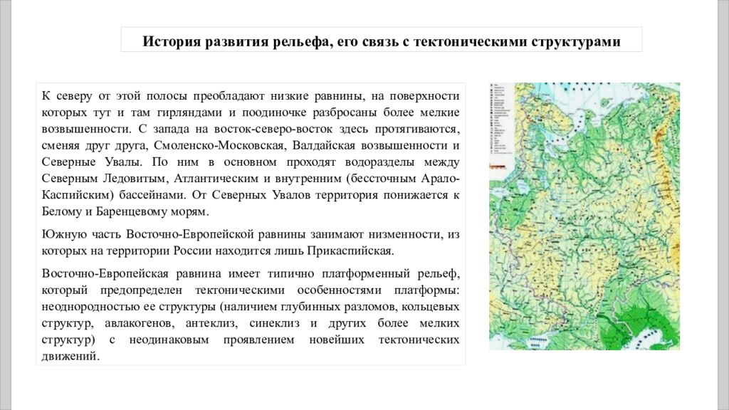 К северу от этой полосы преобладают низкие равнины, на поверхности которых тут и там гирляндами и поодиночке разбросаны более мелкие возвышенности. С запада на восток-северо-восток здесь протягиваются, сменяя друг друга, Смоленско-Московская, Валдайская возвышенности и Северные Увалы. По ним в основном проходят водоразделы между Северным Ледовитым, Атлантическим и внутренним (бессточным Арало -Каспийским) бассейнами. От Северных Увалов территория понижается к Белому и Баренцевому морям. Южную часть Восточно-Европейской равнины занимают низменности, из которых на территории России находится лишь Прикаспийская. Восточно-Европейская равнина имеет типично платформенный рельеф, который предопределен тектоническими особенностями платформы: неоднородностью ее структуры (наличием глубинных разломов, кольцевых структур, авлакогенов, антеклиз, синеклиз и других более мелких структур) с неодинаковым проявлением новейших тектонических движений. История развития рельефа, его связь с тектоническими структурами