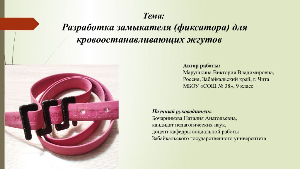 Тема: Разработка замыкателя (фиксатора) для кровоостанавливающих жгутов Автор работы: Марушкина Виктория Владимировна, Россия, Забайкальский край, г. Чита МБОУ «СОШ № 38», 9 класс Научный руководитель : Бочарникова Наталия Анатольевна, кандидат педагогических наук, доцент кафедры социальной работы Забайкальского государственного университета.