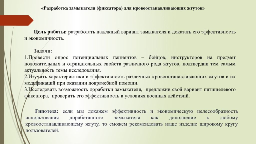 Цель работы: разработать надежный вариант замыкателя и доказать его эффективность и экономичность. Задачи: Провести опрос потенциальных пациентов – бойцов, инструкторов на предмет положительных и отрицательных свойств различного рода жгутов, подтвердив тем самым актуальность темы исследования. Изучить характеристики и эффективность различных кровоостанавливающих жгутов и их модификаций при оказании доврачебной помощи. Исследовать возможность доработки замыкателя, предложив свой вариант пятищелевого фиксатора, проверить его эффективность в условиях военных действий. Гипотеза: если мы докажем эффективность и экономическую целесообразность использования доработанного замыкателя как дополнение к любому кровоостанавливающему жгуту, то сможем рекомендовать наше изделие широкому кругу пользователей. « Разработка замыкателя (фиксатора) для кровоостанавливающих жгутов »