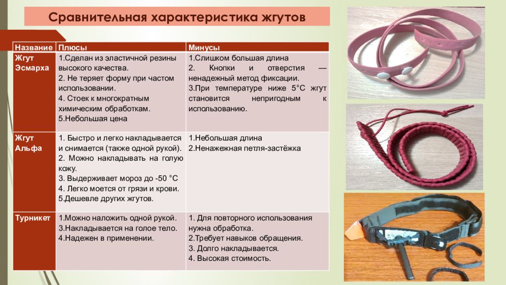 Название Плюсы Минусы Жгут Эсмарха 1.Сделан из эластичной резины высокого качества. 2. Не теряет форму при частом использовании. 4. Стоек к многократным химическим обработкам. 5.Небольшая цена 1.Слишком большая длина 2. Кнопки и отверстия — ненадежный метод фиксации. 3.При температуре ниже 5°С жгут становится непригодным к использованию. Жгут Альфа 1. Быстро и легко накладывается и снимается (также одной рукой). 2. Можно накладывать на голую кожу. 3. Выдерживает мороз до -50 °С 4. Легко моется от грязи и крови. 5.Дешевле других жгутов. 1.Небольшая длина 2.Ненажежная петля-застёжка Турникет 1.Можно наложить одной рукой. 3.Накладывается на голое тело. 4.Надежен в применении. 1. Для повторного использования нужна обработка. 2.Требует навыков обращения. 3. Долго накладывается. 4. Высокая стоимость. Сравнительная характеристика жгутов