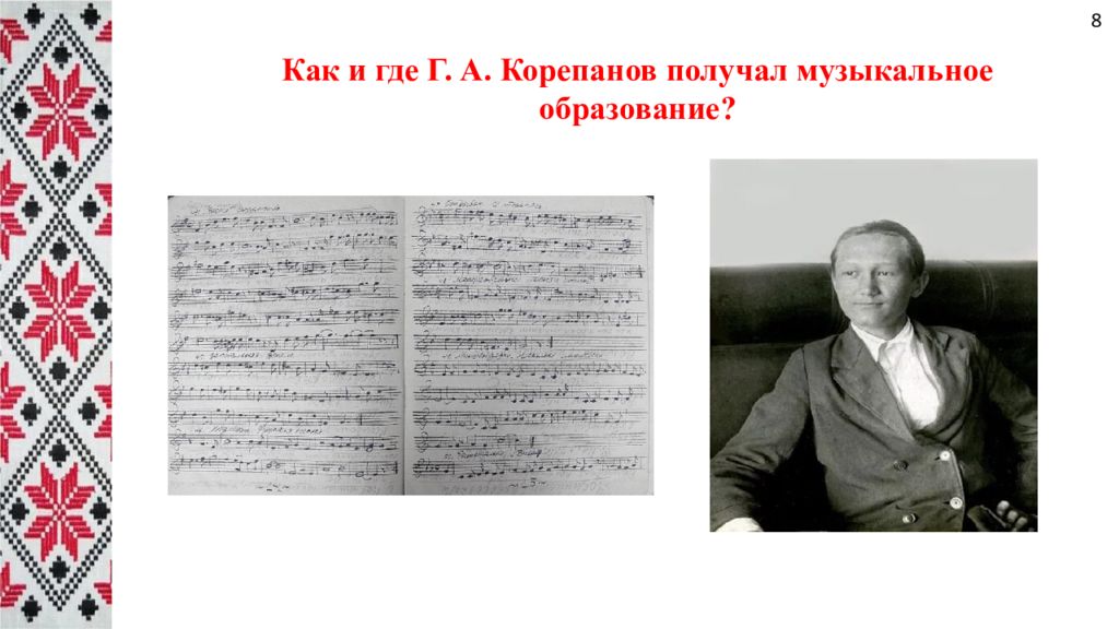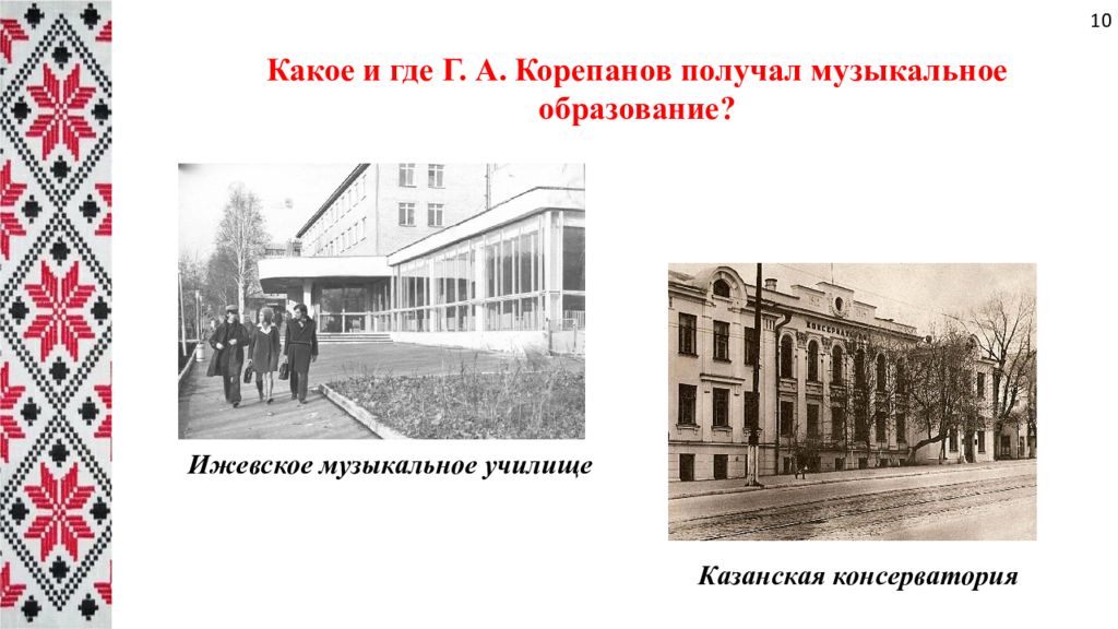 Какое и где Г. А. Корепанов получал музыкальное образование? Ижевское музыкальное училище Казанская консерватория 10