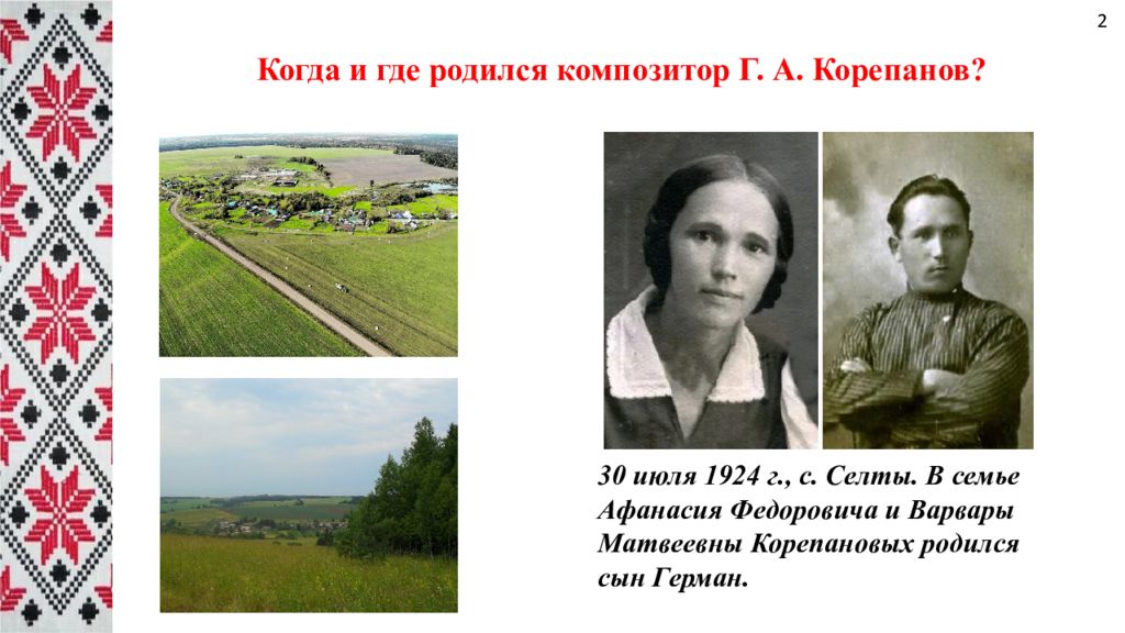 Когда и где родился композитор Г. А. Корепанов? 30 июля 1924 г., с. Селты. В семье Афанасия Федоровича и Варвары Матвеевны Корепановых родился сын Герман. 2