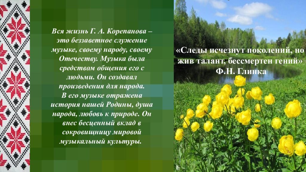 Вся жизнь Г. А. Корепанова – это беззаветное служение музыке, своему народу, своему Отечеству. Музыка была средством общения его с людьми. Он создавал произведения для народа. В его музыке отражена история нашей Родины, душа народа, любовь к природе. Он внес бесценный вклад в сокровищницу мировой музыкальный культуры. «Следы исчезнут поколений, но жив талант, бессмертен гений» Ф.Н. Глинка