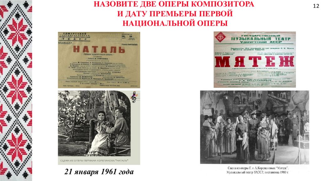 Назовите две оперы композитора и дату премьеры первой национальной оперы 21 января 1961 года 12