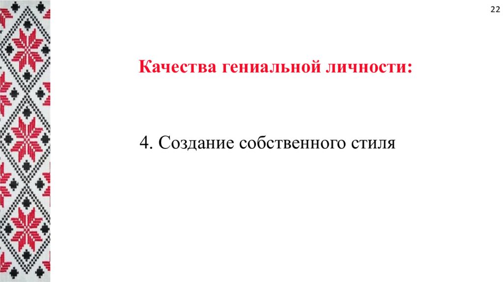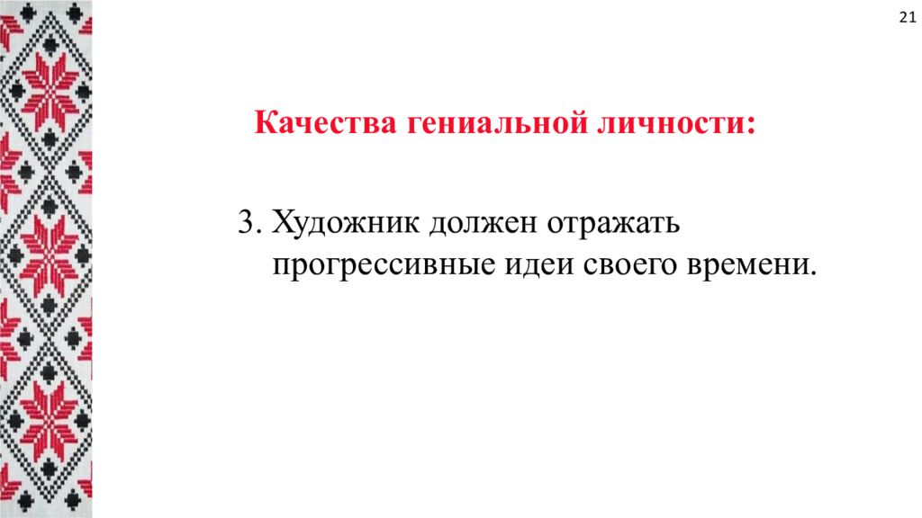 Качества гениальной личности: 3. Художник должен отражать прогрессивные идеи своего времени. 21