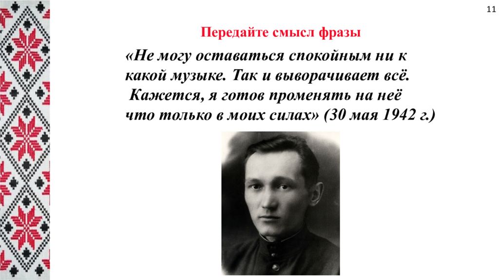 Передайте смысл фразы «Не могу оставаться спокойным ни к какой музыке. Так и выворачивает всё. Кажется, я готов променять на неё что только в моих силах» (30 мая 1942 г.) 11