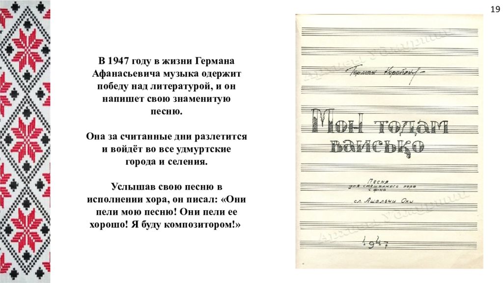 В 1947 году в жизни Германа Афанасьевича музыка одержит победу над литературой, и он напишет свою знаменитую песню. Она за считанные дни разлетится и войдёт во все удмуртские города и селения. Услышав свою песню в исполнении хора, он писал: «Они пели мою песню! Они пели ее хорошо! Я буду композитором!» 19