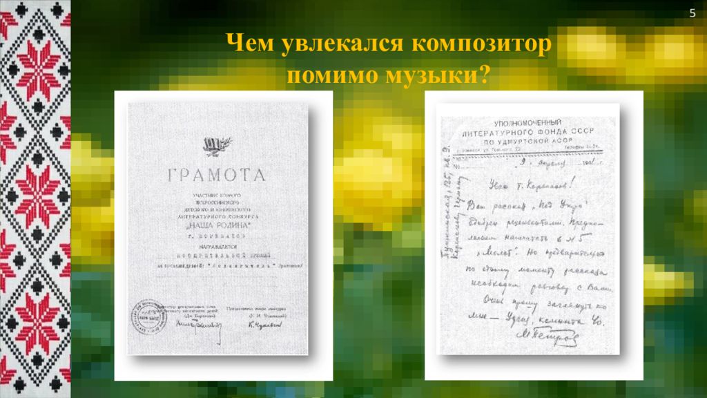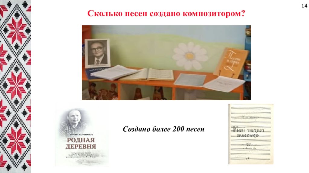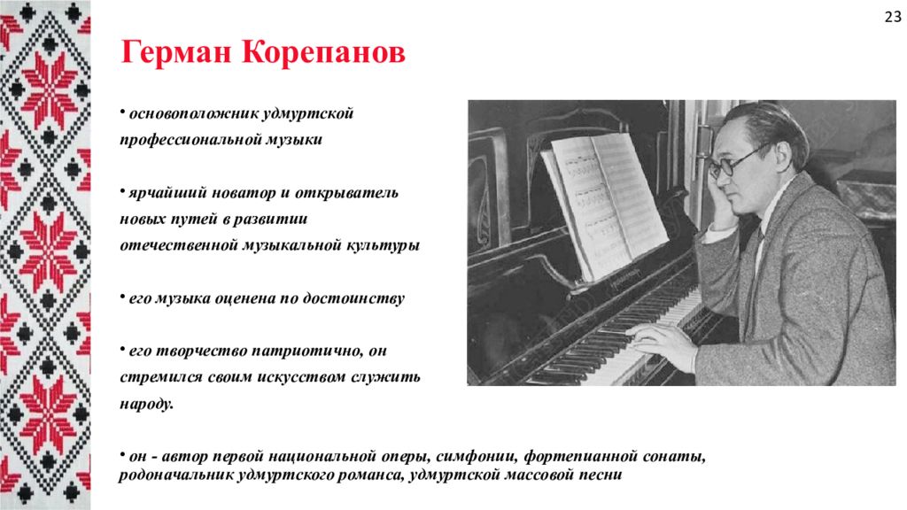основоположник удмуртской профессиональной музыки ярчайший новатор и открыватель новых путей в развитии отечественной музыкальной культуры его музыка оценена по достоинству его творчество патриотично, он стремился своим искусством служить народу. он - автор первой национальной оперы, симфонии, фортепианной сонаты, родоначальник удмуртского романса, удмуртской массовой песни Герман Корепанов 23