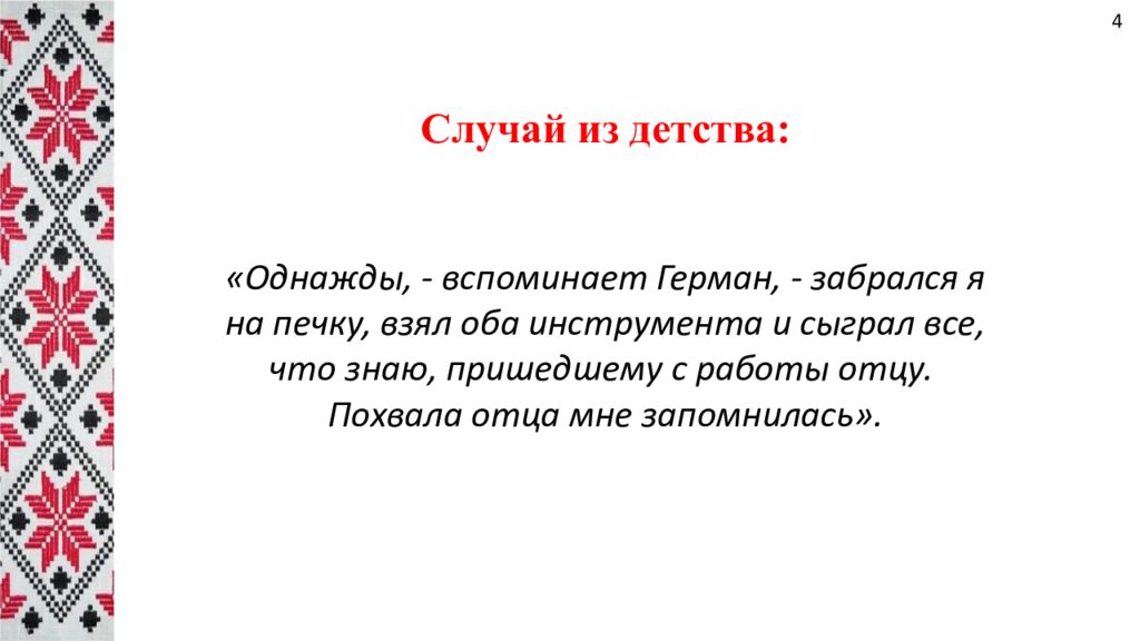 «Однажды, - вспоминает Герман, - забрался я на печку, взял оба инструмента и сыграл все, что знаю, пришедшему с работы отцу. Похвала отца мне запомнилась». Случай из детства: 4