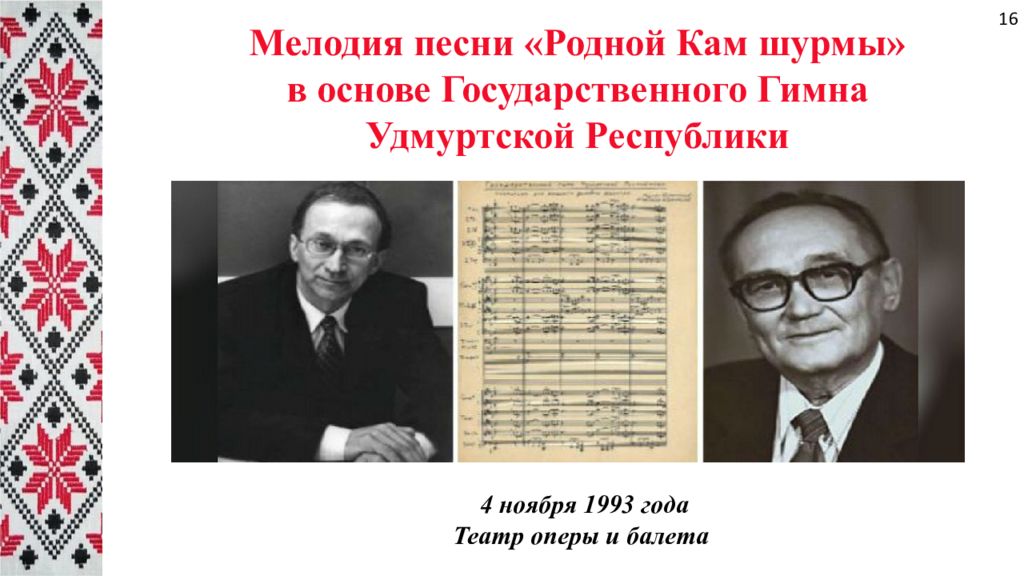 Мелодия песни «Родной Кам шурмы » в основе Государственного Гимна Удмуртской Республики 4 ноября 1993 года Театр оперы и балета 16