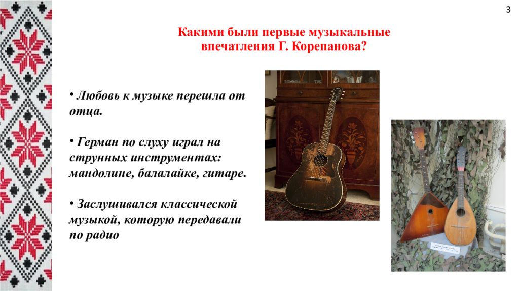 Какими были первые музыкальные впечатления Г. Корепанова? Любовь к музыке перешла от отца. Герман по слуху играл на струнных инструментах: мандолине, балалайке, гитаре. Заслушивался классической музыкой, которую передавали по радио 3