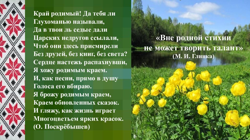 Край родимый! Да тебя ли Глухоманью называли, Да в твои ль седые дали Царских недругов ссылали, Чтоб они здесь присмирели Без друзей, без книг, без света? Сердце настежь распахнувши, Я хожу родимым краем. И, как песни, прямо в душу Голоса его вбираю. Я брожу родимым краем, Краем обновленных сказок. И гляжу, как жизнь играет Многоцветьем ярких красок. (О. Поскрёбышев) «Вне родной стихии не может творить талант» (М. И. Глинка)