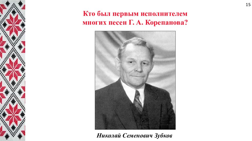 Кто был первым исполнителем многих песен Г. А. Корепанова? Николай Семенович Зубков 15